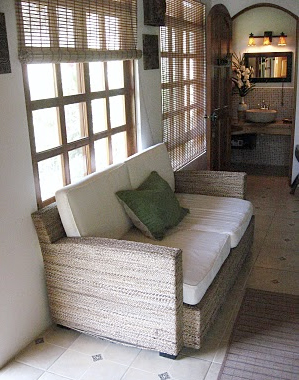 Bungalow Pacifico – Bungalow Pacifico’s composed relaxing design is in keeping with the tropics theme. Two queen beds with stunning seagrass headboards sleep four and an additional single bed can be placed in the room on request. This room has a Balinese vibe and will feel very quiet true to its name.  A/C, ceiling fan, room safe, over sized hot water shower with rain can shower head and cozy bedding complete the Pacifico bonanza. The balcony features comfortable and well appointed chairs for ultimate relaxation.