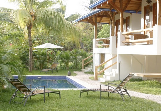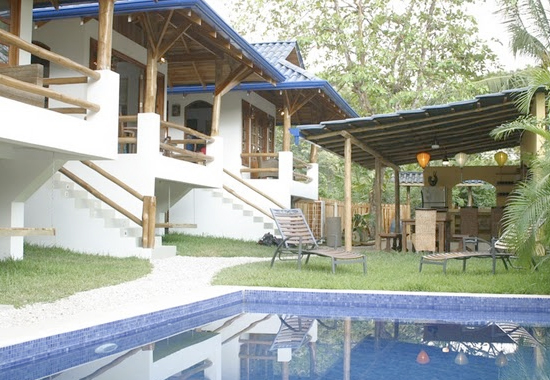 Some amenities offered by the hotel include daily surf lessons, A/C, ceiling fan, hot water, king and queens size pillow top mattress, digital lap top size room safe, rain can shower heads, balcony with comfortable chairs, organic soap and aromatherapy candles, Costa Rican coffee service, daily housekeeping, pool, security guard, open air rancho kitchen fully equipped, internet access, common area: communal direct TV, DVD’s and books and access to phone.