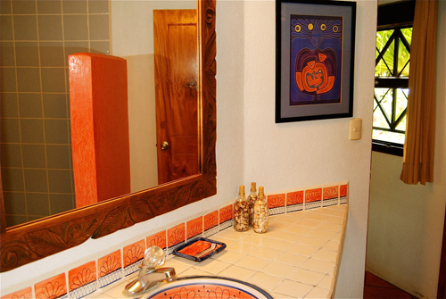 Costa Rican Beach Suite – Casa Azul’s sprawling 2000 sq ft, contemporary, plush two bedroom suite overlooks the pool and ocean. All windows and sliding glass doors are equipped with screens. Each bedroom has a queen sized bed, its own central AC unit, ceiling fan and natural ventilation. One bedroom faces out to the ocean. It has a private balcony accessed through a sliding glass door. Guests can sleep at night in the canopy bed with the glass slider open, screen door shut, ceiling fan on and enjoy the sounds of the surf and star-gazing on Costa Rica’s clear balmy skies. When it gets more sultry, guests can also close the slider and sleep in the comfort of the AC. The rear bedroom has a sliding window overlooking the rear garden and a ceiling fan. It has double doors which can be left open for increased ventilation. This room receives morning sun but is also protected from the harsh afternoon rays. If you prefer to sleep in a cool room, you can close up the room and use the AC.