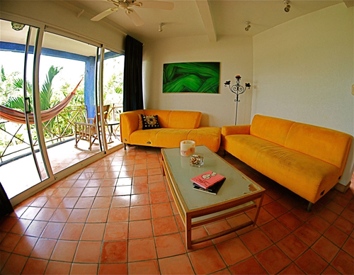 The extensive bathroom has been done up in ceramic tiles throughout and a glass block covered hot water shower. The dining room/kitchen area has an elevated ceiling which peaks at a central ventilation tower. The kitchen has three sliding windows which overlook the pool and ocean. A cedar wood island provides additional workspace and separates the kitchen from the dining area. An American oak dining table with comfortable chairs from Nicaragua furnish the dining room. The living room faces the ocean and offers a spectacular view through a glass wall and the sliding glass door. The glass slider leads to a comfortable balcony, equipped with a hammock and several comfortable chairs. This is one of the favorite spots for several Casa Azul guests. It is a front row seat to study the region’s waves, watch the ocean, admire Costa Rica’s sunset lit tangerine sky, and enjoy the company of your family and friends at the poolside. The living room area is appointed with a ceiling fan, a two-piece sofa and a glass coffee table.