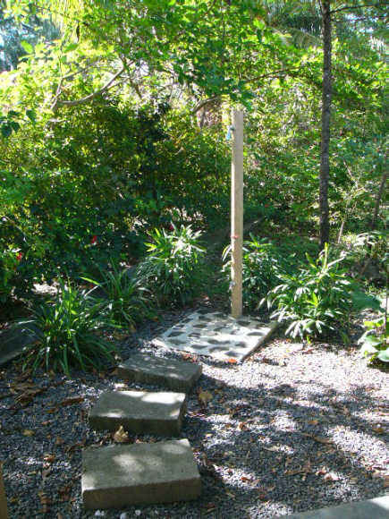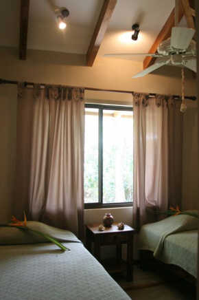 This rental villa is approximately 1 mile north of the town proper and is one of four houses in a residential complex on a 4 acre property with a 100 meter beachfront. The house is a short walk 100 meter walk to the beach. This 800 sq ft house is surrounded by exotic fauna and hardwood tropical trees and has two bedrooms of equal size and one bath.