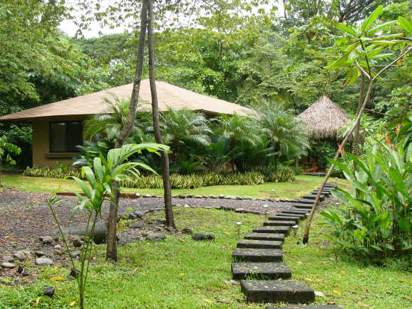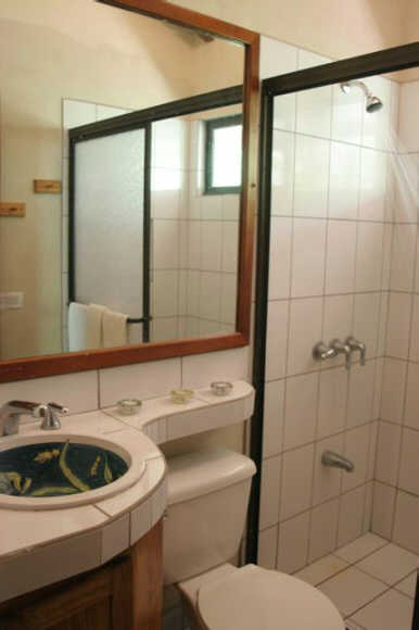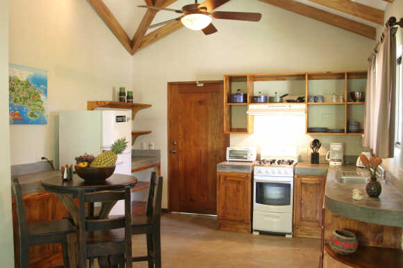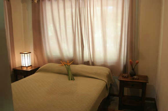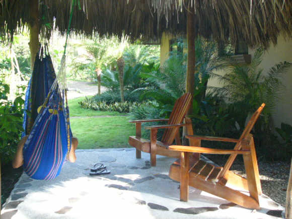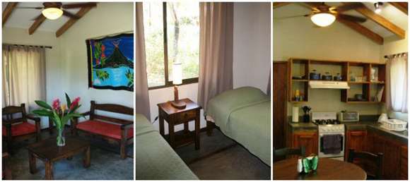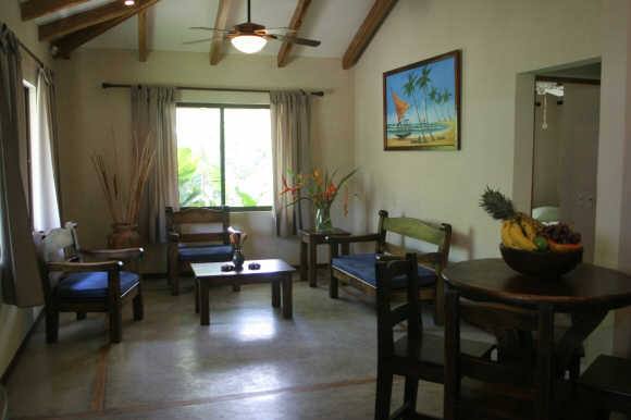 In one of the bedrooms is a queen sized bed while the other room has two single beds. Both bedroom are air conditioned and with closets. Hot water runs in the bath tap. Casa Iguana’s living room is furnished with hardwood furniture and decorated in tasteful Costa Rican style.