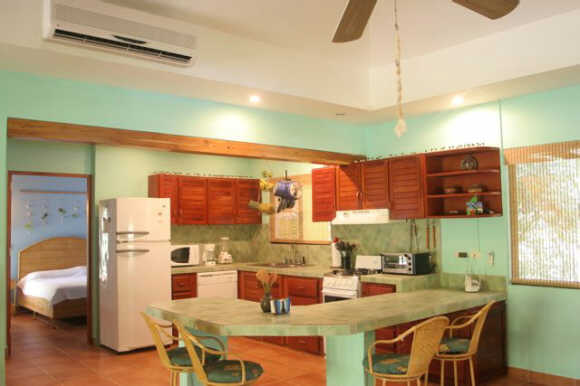 Casa Pelicano is endowed with typical handmade Costa Rican wicker furniture. The master bedroom “Honeymoon Suite” offers a King size bed, a full and a double slider out to the terrace overlooking the pool and its own private bathroom. This 650 square foot new addition is appointed with high quality finishing, stone floors, exquisite marble countertops, Helvex fixtures and an overhead rain water shower. The second master bedroom has a King size bed, a private bathroom and closet with a safe. The third bedroom is a “Kids room” with a bunk bed, ample closet space and a bathroom next door. This layout of this home makes it ideal for families with kids and large groups of friends on a budget, looking to enjoy the conveniences of a vacation stay without burning a deep hole in their pocket.
