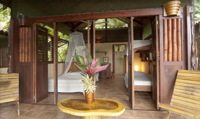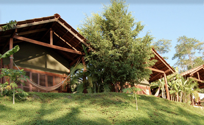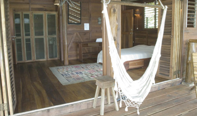 Bungalows – All bungalows have a private bathroom which is partly open to the sky for hot water showers under the sun or stars, a small kitchenette, fridge, safe box and wood furnishings. Their bungalows are built with an effective ventilation system, and each has a ceiling fan. All beds have orthopedic mattresses. Each bungalow features a private veranda with hammock where guests can relax in the backdrop of Santa Teresa’s spectacular sunset.