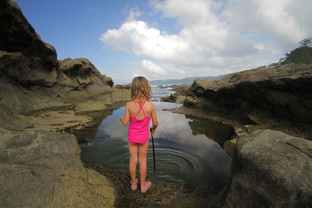 There are two great tidpool excursions in the area. The best one is in Playa Hermosa and its huge (only visible at low tide.) Lots of families go their with kids and learn to swim and snorkel since it’s never more than waist deep. Fish and other things can be found swimming around. My daughter learned to snorkel here. Malpais also has great tidepools at Mar Azul. Here, there are dozens of them, with bright colors and all kinds of interesting sizes. Many are nearly perfectly circular and very photogenic. Click below for more details about each: