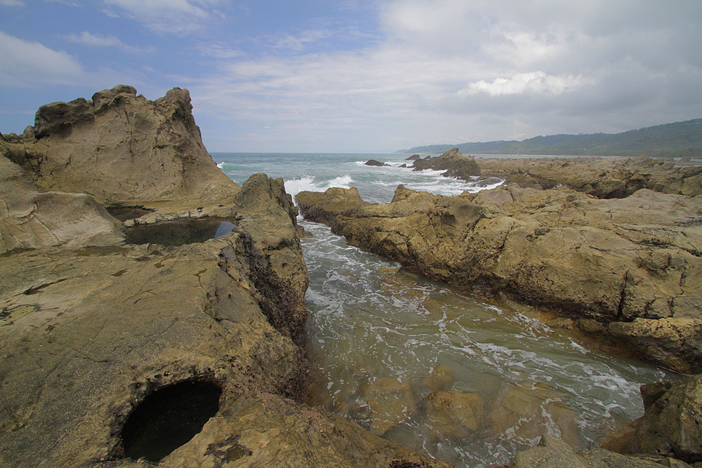 In Malpais, they can be found by turning towards the beach at the sign that says “Mar Azul” and when you get to the end of the road, turn left. You’ll feel like you’re in someone’s driveway, but keep going and the road will empty onto a large grassy area where you can park and explore dozens of incredible tidepools and beaches. There are places where you can sit in nearly perfectly circular tidepools, like miniature jacuzzis, lined with beautiful colors, with the waves crashing nearby and a view down the coast.