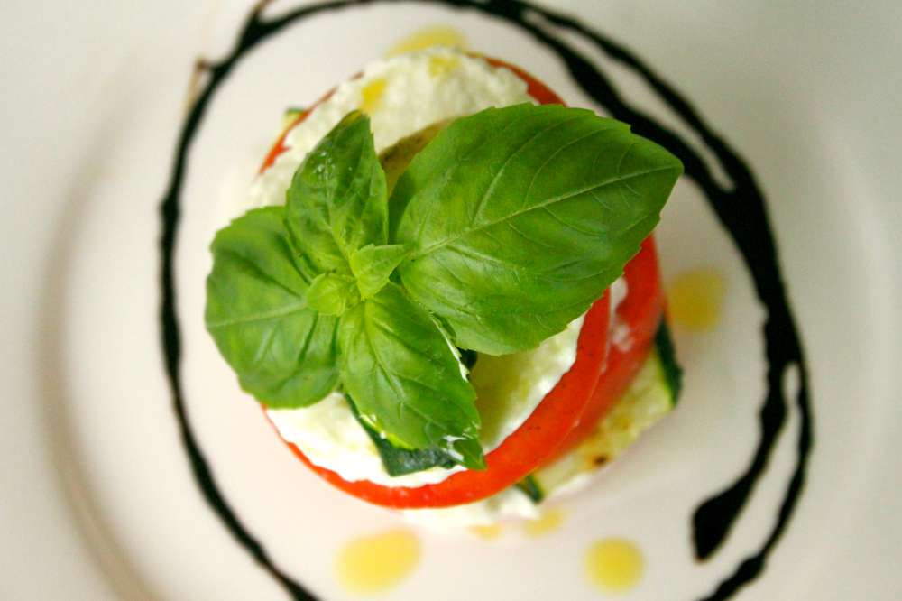 Insalata Caprese Layers of fresh sliced tomatoes, grilled zucchini and Buffalo mozzarella