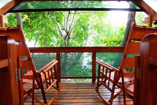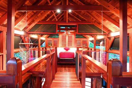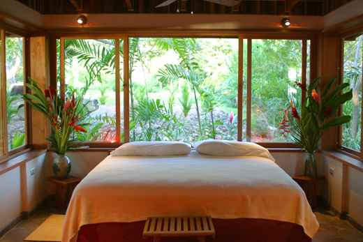 This villetta has fast gone on to become one of Red Palm Bungalow’s most popular accommodation options. It is a haven of hummingbirds, butterflies, monkeys and squirrels. The home was hand crafted for meditation and relaxation, an ideal place for a Costa Rica vacation or honeymoon. The design attributes of a yoga hermitage were meticulously analyzed and used to integrate vistas, location, materials and nature into a carefully woven and fully incorporated architecture. Offering a fully air conditioned space, encircled by large windows, the sprawling and relaxing mini-villa almost overpowers you with its vivid colors larger than life lush gardens. Guests enjoy idyllic views of the estate gardens from each angle of every single room. Constructed with indigenous sustainable woods and materials by master local craftsmen, the hardwood floor faces west and is doused in perfect for sunset hues. Balancing details of touch and sight, painstakingly crafted by years of experience, this villa makes you feel like you are in a dream from which you never want to wake up.