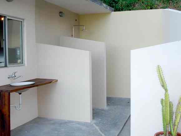 There is a relaxing pool amidst abundant greenery right outside the bungalow. Sunset Villas is not very high on luxury, wherein lies its real appeal. It’s a basic, rustic, back to nature type of place that is replete with tree house style rooms, relaxing hammocks and the signature greenery and wilderness of Santa Teresa. You have earthy elements like cobbled stoned walls, paved paths and wooden doors and walls. It’s an all open space designed with the intention of keeping guests as close as to nature as possible. There is plenty of greenery everywhere including guest rooms and bathrooms (you’ll see potted plants all around the room).