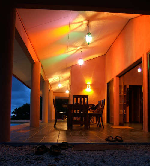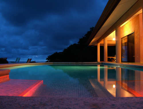 Guests can enjoy bonding moments in the house’s cozy living room. It also has a small kitchen counter equipped with a refrigerator to store food and cool water and other beverages. The dining area is outside the foyer area making it perfect for intimate dinners and celebrations. The foyer gives one a good view of the pool and the ocean. You can also opt to go to the patio with its over sized reclining deck chairs where you can lie and relax as your eyes bathe in the wonderful view of the ocean just a few meters away. There are also reclining beach chairs in the pool area where you can sunbathe during the day and stargaze at night.