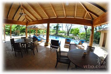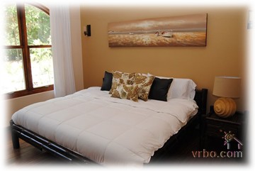The villa’s whole front has glass sliders that give a full view of the ocean. Guests can enjoy the outdoors while lounging on custom made teak furniture in the Villa’s huge roofed patio with bamboo ceiling or taking a dip and in the Villa’s large pool. Doors on different sides of the house could be opened to let the warmth of the sunshine and the refreshing ocean breeze in but it you find it a bit too warm all doors can be closed and the air conditioners turned on.