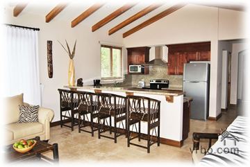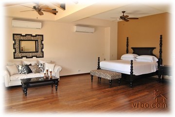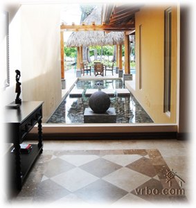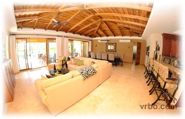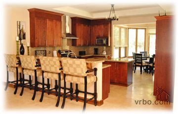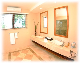 Owned by a builder from Newport Beach, Ca. attention to details and style is evident all throughout the villa. You will not feel at all cramped in this 5000 sq. ft. villa which has five very spacious bedrooms, with high ceilings, Andersen doors and8 ft. windows that give a good view of the beautiful ocean. For a tropical ambiance two of the master suites have bamboo flooring. Each room has a private bath with floors made of natural stone, counter and showers all custom designed for a tropical feel. Rooms can be locked off for smaller groups. Both gourmet kitchens have neat stainless sinks and granite counters, and basic kitchen appliances. The kitchen nook can sit 6 while 4 can sit on the counter bar stools. The villa has a very spacious24 x 24 living room with Travertine flooring which joins the dining area with a table for 10.