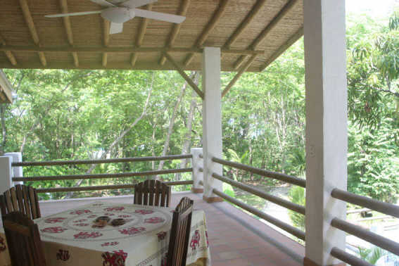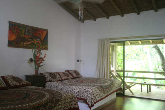 Bedroom 5 (sleeps up to 3 guests) – This beautiful room on the second floor includes a double bed and single bed, a/c. cable tv, fan, safe. Natural light enters via skylights making the bathroom light and airy, overlooking the tropical gardens a balcony with chairs and hammock.