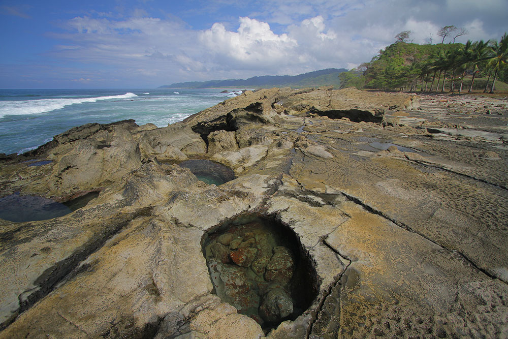 In Malpais, they can be found by turning towards the beach at the sign that says “Mar Azul” and when you get to the end of the road, turn left. You’ll feel like you’re in someone’s driveway, but keep going and the road will empty onto a large grassy area where you can park and explore dozens of incredible tidepools and beaches. There are places where you can sit in nearly perfectly circular tidepools, like miniature jacuzzis, lined with beautiful colors, with the waves crashing nearby and a view down the coast.