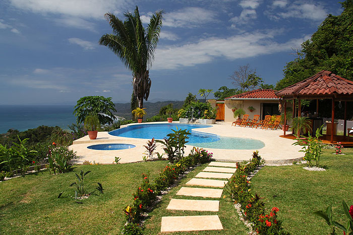 Villa de Amor is nestled on top of a hill overlooking the scenic beaches of Malpais and Santa Teresa. The vistas one can catch from here are absolutely ravishing- guests can literally view the waves hypnotically splashing on the Sunset Reef, Los Suecos, Mar Azul, and other beaches in the area, in addition to sweeping views of the entire coastline to the north and the naturally endowed Cabo Blanco national park in the southern end. The house is constructed in typical Costa Rican style: huge open windows with striking panoramic visuals from each room and a huge roof overhang for keeping the tropical heat at its minimum.  The whole house features a tiled deck complemented by beautifully kept lush tropical gardens.